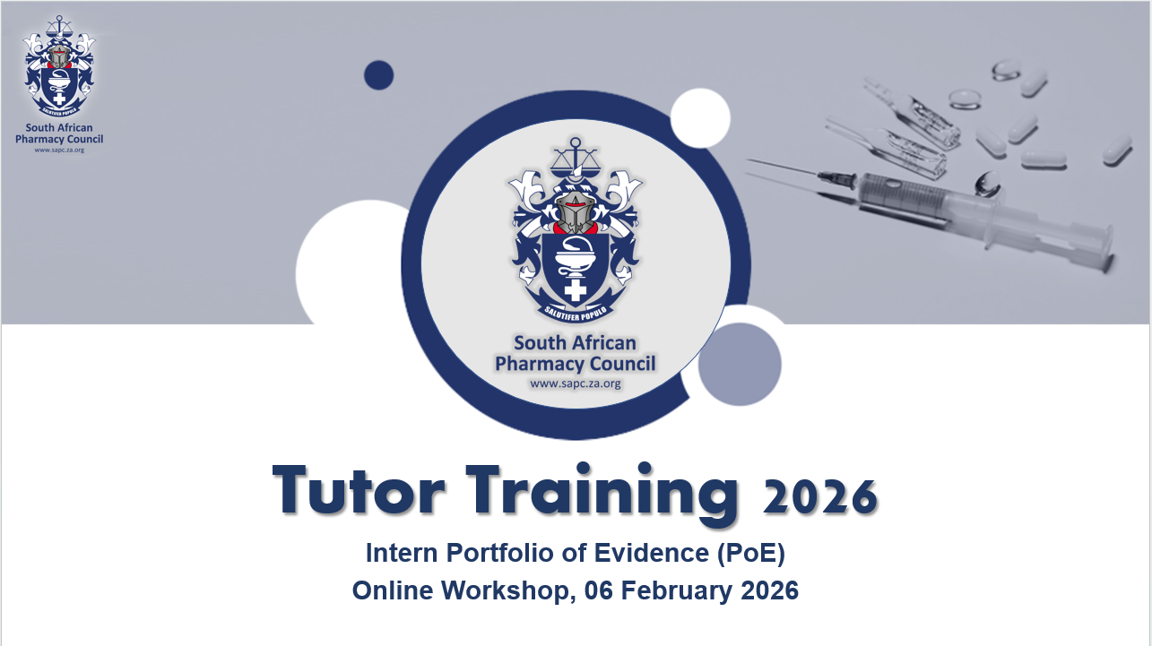 Pharmacist's Assistant (Basic) EISA Workshop - 5 February 2026 (Thursday) - 09:00 - 12:00The South African Pharmacy Council (SAPC) will be conducting a virtual EISA workshop using Microsoft Teams. The EISA manual and Practice EISA papers can be accessed on the following link https://www.pharmcouncil.co.za/Learner_Assessment. Should you have any queries, please do not hesitate to contact SAPC at psp.eisa@sapc.za.org Join the live workshop at 09h00 on Thursday, 05 February 2026, using any of the below platforms: Microsoft Teams https://bit.ly/BasicEISAWorkshop YouTube https://www.youtube.com/live/NrGnZ8KTTY0?si=xKw6rbKQPsgWXWYN |
