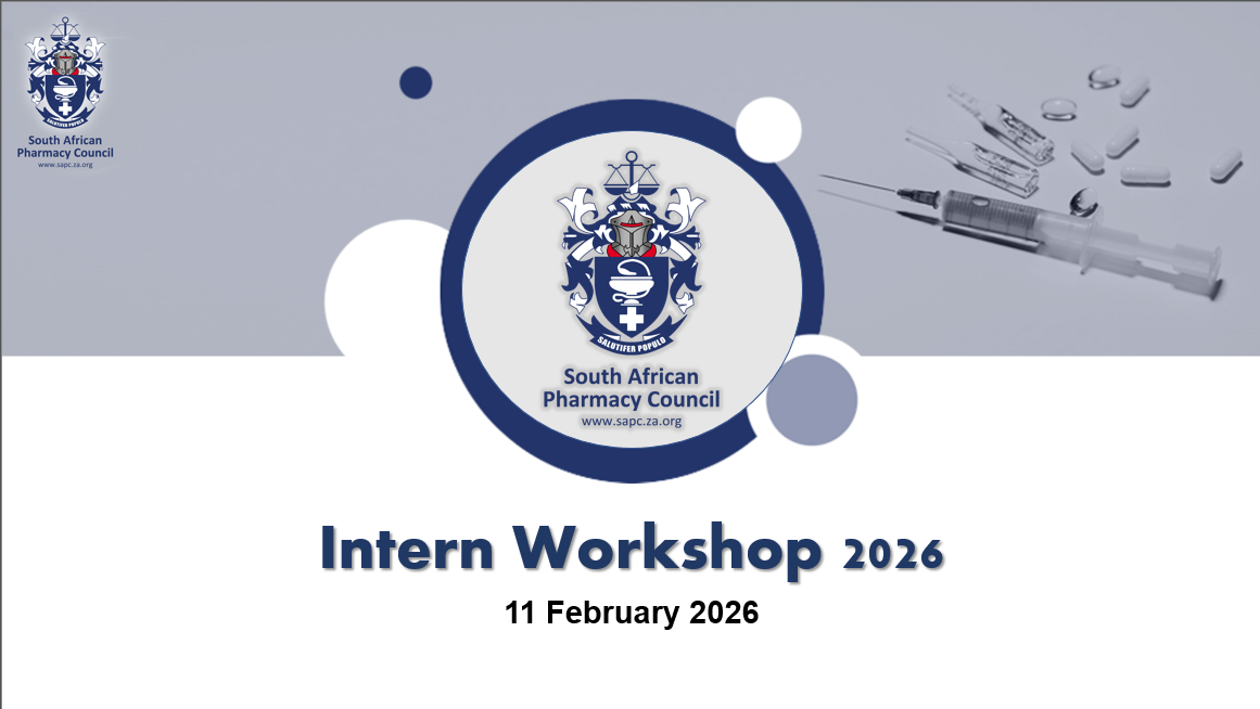 Intern Workshop - 11 February 2026 (Wednesday) - 09:00 - 12:00In terms of the programme for the pre-registration year, Council has scheduled information sessions (Intern Workshops) that Pharmacist Interns must attend. The workshops will be conducted virtually (via Microsoft Teams) in February and March 2026, over three (3) days. Tutors are not obliged to attend the Intern workshops since the Office of the Registrar has scheduled separate Tutor Workshops. Join the live workshop at 09h00 on Wednesday, 11 February 2026, using any of the below platforms: Microsoft Teams https://bit.ly/3MdaJs6 YouTube https://bit.ly/3Z6WKHv |